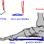 V pozadí všech stížností se nachází Achillova šlacha případně poranění jeho hlenového váčku. V těžších případech se může vytvořit i trnovitý výrůstek v místě napojení šlachy na kost patní. Ve většině případů pomůže vhodná vložka do bot. Nadzvednutím paty se sníží napětí šlach. Na tlakovém snímku lze vidět jednak zborcenou podélní klenbu, jakož i silně zatíženou (bílá) oblast paty. Pomocí vložky, která poněkud nadzvedne patu a podepře klenbu, bolest ustane.