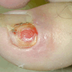 Příznaky jsou charakteristické. Zanícené a silně bolestivé ložisko na nehtovém lůžku. V této fáze nemoci je nutné chirurgické ošetření.